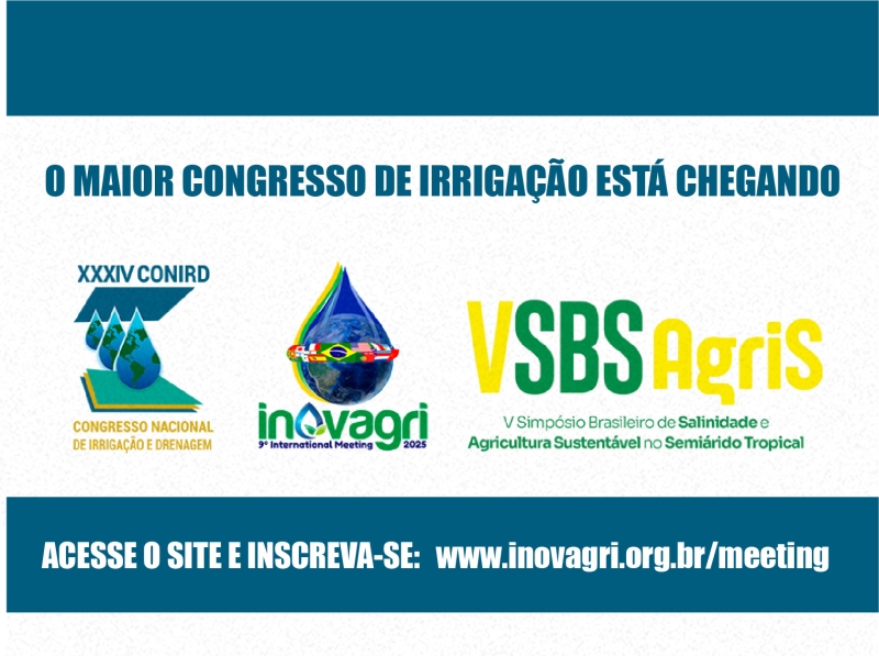 A 34ª edição do Congresso Nacional de Irrigação e Drenagem - XXXIV CONIRD, sob o tema principal “Agricultura Irrigada: Gestão Hídrica, Tecnologia e Resiliência Ambiental” acontecerá conjuntamente com a 9ª edição do Inovagri International Meeting e o V Simpósio Brasileiro de Salinidade e Agricultura Sustentável no Semiárido Tropical, no período de 3 a 5 de novembro de 2025, na cidade de Fortaleza- CE.